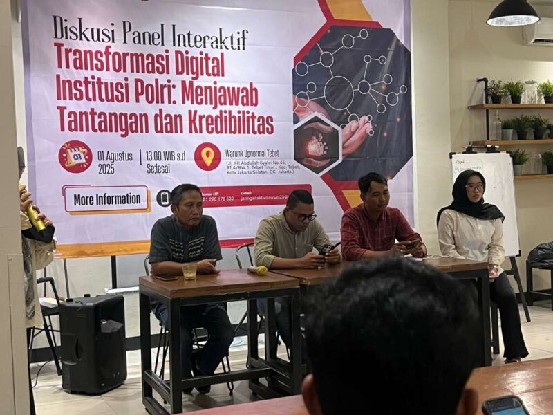 JAKARTA || Jaringan Aktivis Nusantara menyelenggarakan Diskusi Panel Interaktif bertajuk “Transformasi Digital Institusi Polri: Menjawab Tantangan dan Kredibilitas”, pada Jum’at (1/8) pukul 14.10 WIB, bertempat di Warunk Upnormal Tebet, Jakarta Selatan.