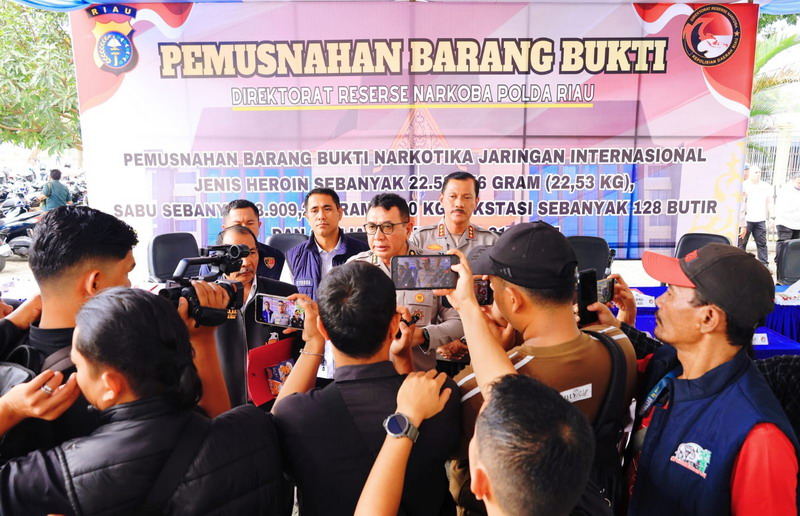 Barang bukti yang dimusnahkan terdiri dari heroin seberat 22,53 kilogram, sabu 3,9 kilogram, ekstasi sebanyak 128 butir, serta ganja 56,31 gram. Pemusnahan ini merupakan hasil pengungkapan tujuh kasus narkotika dengan total 10 tersangka yang berhasil diamankan jajaran Ditresnarkoba Polda Riau.
